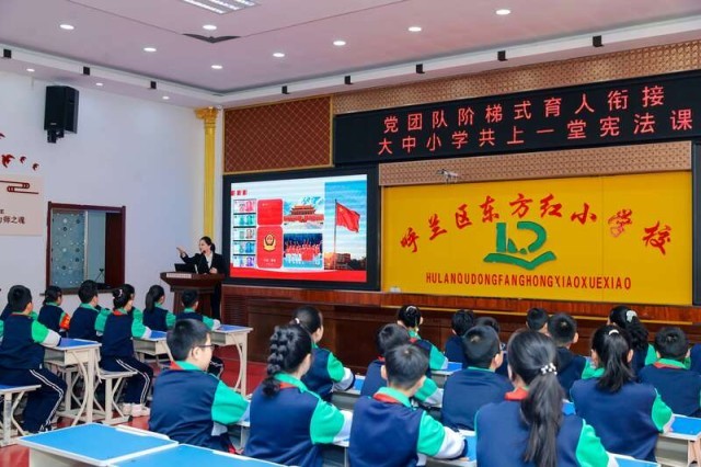 中国青年报客户端讯(宋建申 中青报·中青网记者 杨雷)12月1日,为迎接第十二个国家宪法日,哈尔滨市呼兰区“党团队阶梯式育人衔接大中小学共上一堂宪法课”主题活动,在东方红小学校举行。
