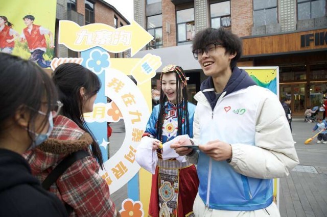 12月4日,成都东郊记忆文化广场,身着藏族服装的青年文旅志愿者正在向游客推介九寨沟景区旅游文化。汪龙华/摄