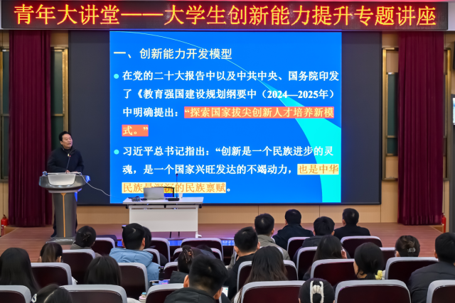 活动期间,该校团委邀请专家做客“青年大讲堂”,围绕大学生创新能力提升以及“挑战杯”备赛指导开展2场专题讲座。讲座内容涵盖创新能力的概念内涵及其时代意义、“挑战杯”赛事政策深度剖析、前沿技术动态追踪以及未来产业发展展望,为学生提供了专业化、精准化的竞赛指导与视野拓展。商学院、化学与材料工程学院、数学与统计学院分别邀请各领域专家开展学术讲座,聚焦学科前沿领域,为师生带来了兼具深度与广度的学术盛宴。