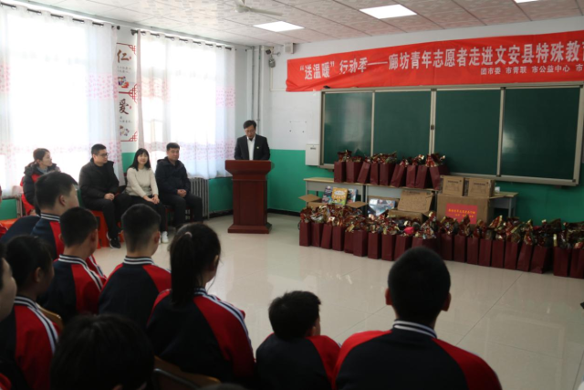 近日,团河北省廊坊市委联合廊坊市青年联合会、廊坊市公益中心、廊坊市志愿者协会到文安县特殊教育学校,以物资帮扶与情感陪伴的双重助力传递社会关怀,为残障儿童营造有爱的成长氛围、带去节日温暖。