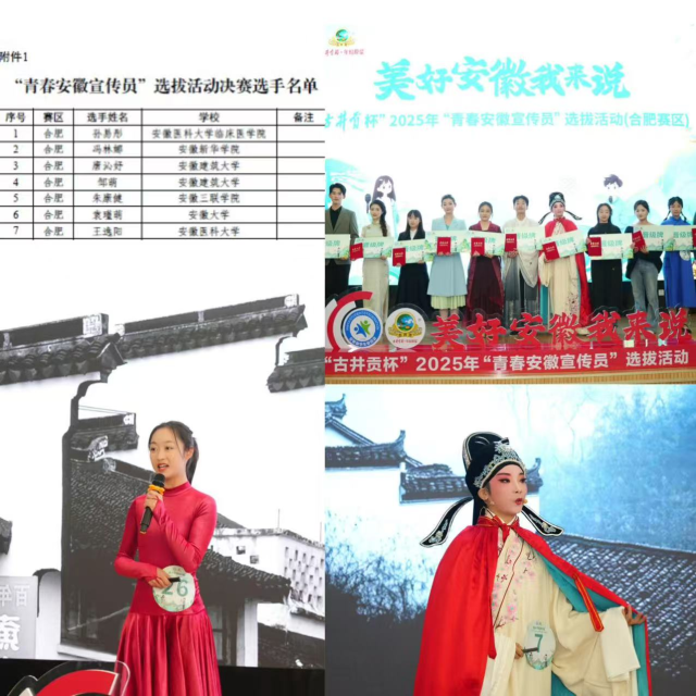 强调“教育性”,红色美育培树青春正气。2025年,校团委将“五史”教育与校园文化建设紧密结合,打造青年话语体系的“红色引擎”;弘扬中华传统文化,筑牢青年红色文化根基,让红色基因融入青春血脉。在安徽省大学生戏剧(戏曲)与朗诵专项展演活动中,校团委统筹协调,联合各学院协同发力,紧紧围绕“弘扬中华优秀传统文化”的主题,精心打磨参赛作品;承办团安徽省委“美好安徽我来说”选拔赛,两名学子成功晋级全省总决赛并获2025年“青春安徽宣传员”称号。