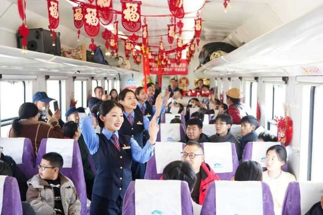 列车工作人员还给旅客带来文艺表演。一首歌曲《理想》,以激昂旋律诉说青春担当,祝愿旅客新岁逐梦顺遂;温情脉脉的《小美满》,用柔软曲调勾勒阖家团圆的美好图景,引发归乡人的深深共鸣;猜灯谜环节则巧妙融合铁路元素与新春祝福;动感十足的舞蹈《向快乐出发》点燃了全场氛围;活动最后,全体人员共同唱响《相亲相爱》,悠扬的歌声在车厢内久久回荡,让来自五湖四海的旅客忘却陌生、倍感亲切。