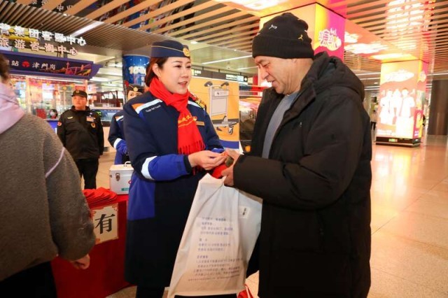 天津青年志愿者开展“暖冬送福”活动,为返乡旅客送上春联、福字。团天津市委供图