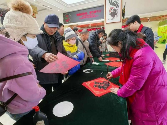 活动现场,十余位书法家展纸挥毫,写就寓意吉祥的春联、圆润饱满的“福”字,为游客与景区一线职工送上文化味十足的“小年礼”。活动吸引往来游客驻足观看,许多家长带着孩子尝试书写属于自己的“福”字,近距离感受书法的艺术魅力。