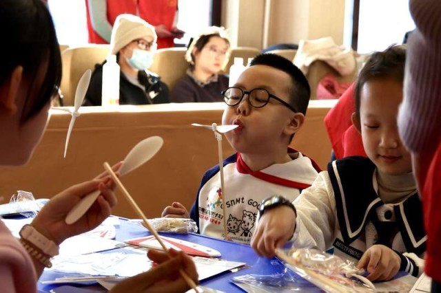 1月14日,哈尔滨,40名新就业群体的未成年子女参加了黑龙江共青团·伙伴计划试课活动。一个小朋友拿起橡皮筋动力飞机螺旋桨,用嘴吹动。中青报·中青网记者 杨雷/摄