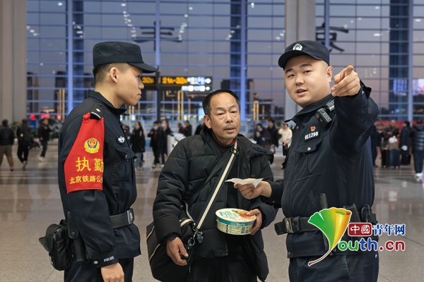 吕晨阳在站区帮助老年旅客指路。中国青年网通讯员 刘静 供图