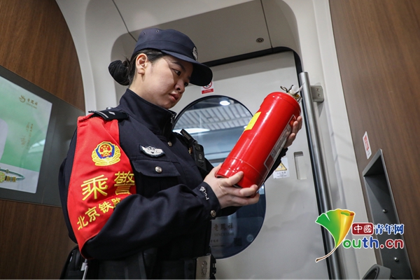 霍宇莹对列车消防设施进行检查。中国青年网通讯员 周倩 供图