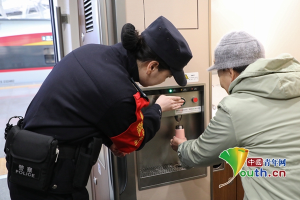 霍宇莹协助旅客取用开水。中国青年网通讯员 张正 供图