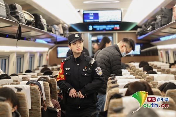 霍宇莹,北京铁路公安处女子乘警队民警。她值乘的G597次列车单程穿越近1400公里,往返北京与上海之间,途经5省10站。439.8米长的高铁车厢就是她的“主场”,她要在这个移动的辖区里连续工作近22个小时,行走近3万步。