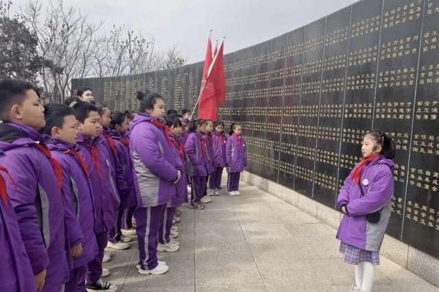 随后,全体人员缓步绕行革命烈士纪念碑,瞻仰烈士英名墙,敬献手中所持的小白花,聆听“红领巾讲解员”现场讲述英烈事迹。