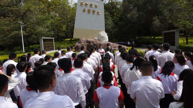 团云南省委机关干部、各地党团员干部、少先队员代表近300人前往东川区人民公园英雄纪念碑广场举行公祭仪式。全体人员聆听英烈事迹、敬献鲜花、默哀鞠躬。