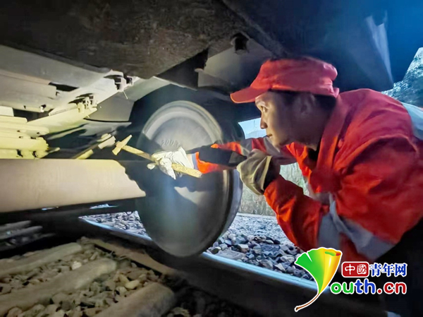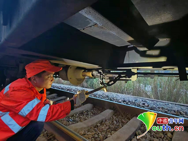 韩州在检查铁路货车。中国青年网通讯员 林钦仁 供图