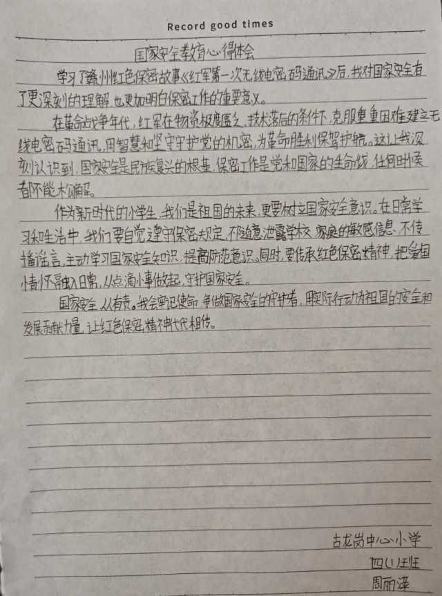【短评】古龙岗中心小学的这堂课,好就好在“实”字:实地参观而非课堂灌输,真情实感而非空洞表态,真实表达而非形式留痕。兴国是苏区精神的重要发源地,红色资源富集。把旧址变成课堂、让历史说话、请学生主讲,这种沉浸式、互动式的教育方式,值得在更多青少年思政教育场景中推广。国家安全教育要入脑入心,关键在“贴近”。贴近青少年认知特点,贴近本土红色资源,贴近日常生活情境。当“国家安全”从一个宏大概念变成可触摸的历史、可感知的故事、可参与的行动,才能真正在青少年心中扎根。