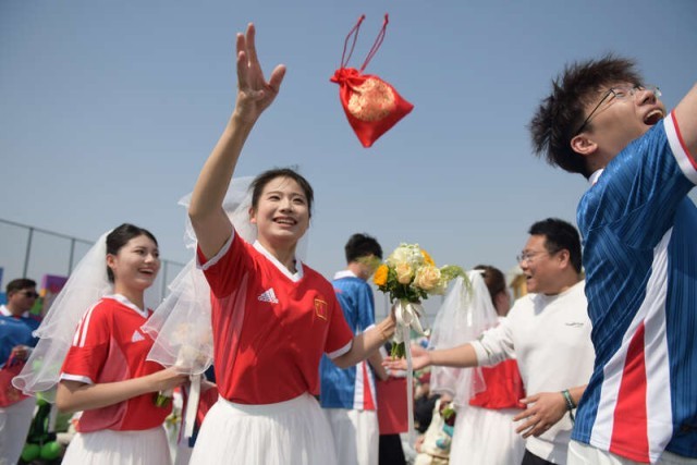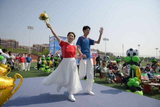 天津市宁河区举办“青春同路·爱在绿茵”第四届京津冀青年集体婚礼。团天津市宁河区委供图
