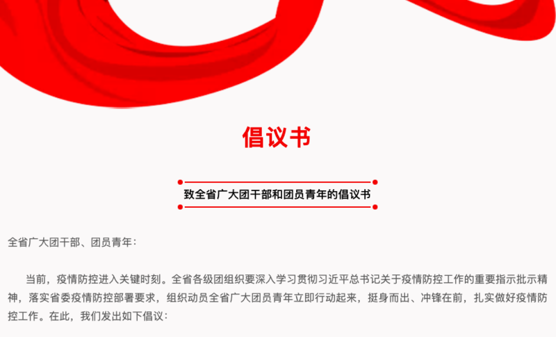 《倡议书》提出,广大团干部和团员青年要带头严格遵守疫情防控各项规定,增强自我防护意识,养成良好生活习惯,及时接种疫苗,配合做好核酸检测。不前往中高风险地区,减少不必要的出行,做到不聚集、不聚餐。引导身边亲友正确认识和对待疫情,不造谣、不传谣、不信谣,维护社会安定稳定。